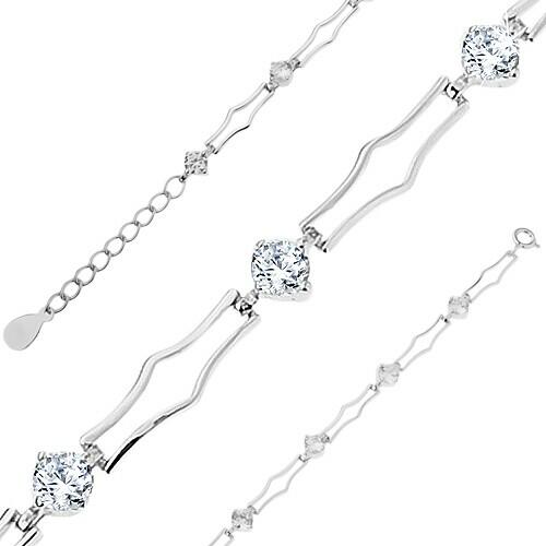 925 ezüst karkötő állítható hosszal szabálytalan téglalap körvonalakból, amelyek kör alakú, csiszolt cirkónia kővel váltakoznak. Viselését delfinkapocs teszi lehetővé. Szélesség: 5 mmHossz: 165 mmHosszabbítható rész: 30 mmSúly: 4,7 gFémjelzéssel ellátott.
