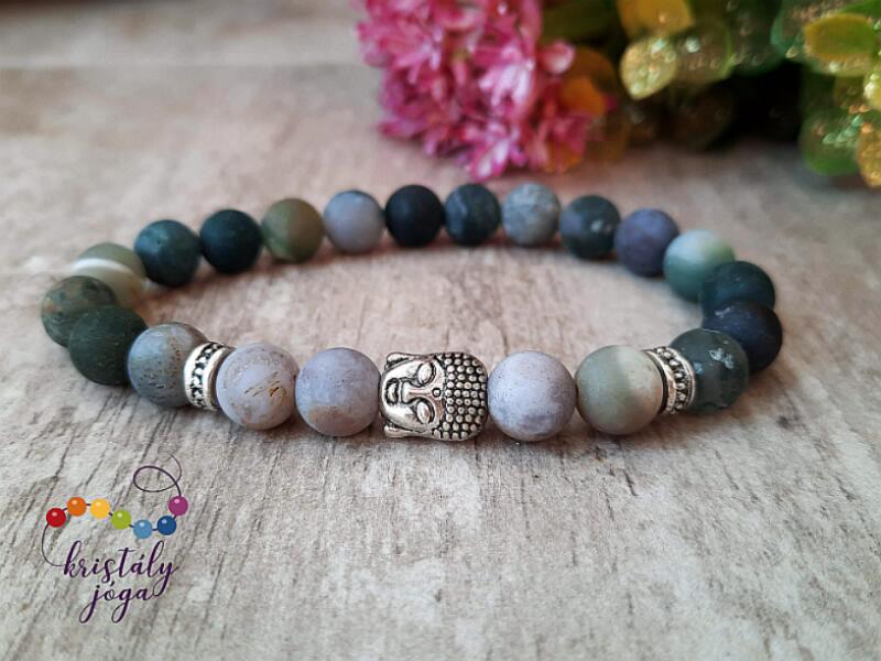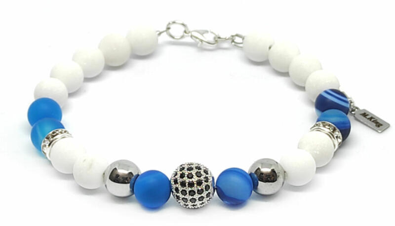 Figyelem! Nem szakad, nem nyúlik! Tartós ékszer. Kérheted csat nélküli rugalmas gumidamilra is. Amennyiben rugalmas damilra kéred, Megjegyzésbe írd be rendeléskor, hogy csat helyett rugalmas gumidamilt kérsz, és a csuklód körbemért méretét is írd meg. Az ékszer ásványai és tartozékai: – 8 mm-es matt kék Achát ásványok – 8 mm-es fehér matt Jade ásványok – 8 m
