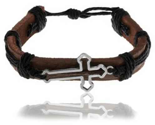 Sötétbarna színű műbőr szalagból álló karkötő, amelynek közepén díszítés - lóhere keresztkontúr. A karkötő hossza extra zsinórokkal állítható. Szélessége: 12 mmHossza: 175 mmExtra zsinór hossza: kb. 125 mm (+/-5%). A medál méretei: 34 x 21 mmAz ár egy darabra értendő.
