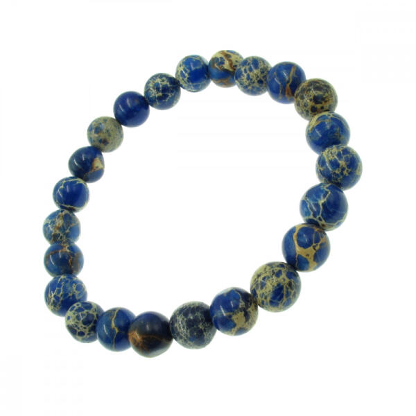 Lápiszkék regalit imperiál jáspis gumis karkötő. A gyöngyök mérete 8mm, a karkötő hossza választható A karkötőből több darab elérhető, a fotó a raktáron lévő valamely ékszerről készült, így mintázata némileg eltérő. A jáspis vélt hatása