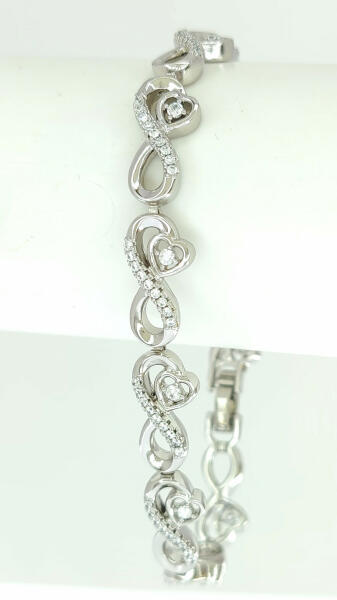 Ezüstszínű karkötő, melyet fehér cirkónia kristályok tesznek csillogóvá, végtelen jel és szív motívumok díszítenek. A kristályok karmos foglalatban helyezkednek el. Időtálló ékszer, nem feketedik, nem színezi a bőrt ("gold filled"). Mindennapi használatra is tökéletes választás. Antiallergén ékszer. Karkötő szélessége: 8 mm. Az antiallergén ékszerek olyan fémö