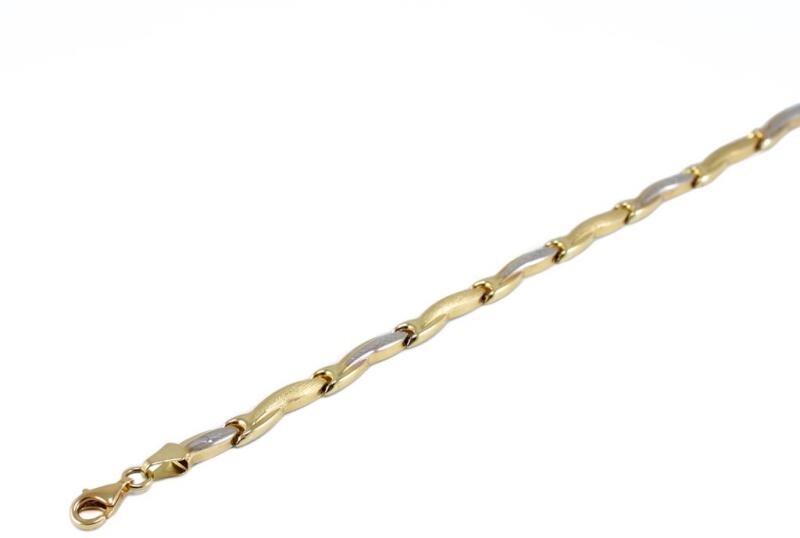 Modern és kedvelt fazonú, mattírozással, ródiummal és véséssel díszített, üreges kialakítású bicolor arany karlánc.