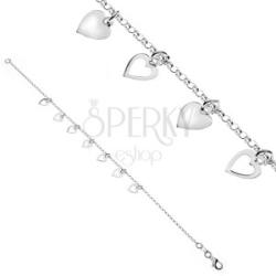 Sterling ezüstből készült karkötő kerek láncszemekből. A láncon hat darab szívecske medál díszeleg - három darab telt és három üreges. Delfinkapocs zárás. A karkötő hossza: 195 mm (+/- 5 %)Szívecske mérete: 6 x 6 mmA karkötő súlya: 2,4 gFémjelzéssel ellátott.