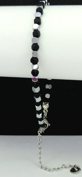 Ezüstszínű nemesacél (316L) sodrony karkötő, melyet fekete akril és nemesacél kocka alakú szemek díszítenek. Időtálló ékszer, amit fürdéskor sem kell levenni, bátran viselhető folyamatosan. Antiallergén ékszer. Hossza: 18,5 cm + 5 cm hosszabbító. Szélesség: 3 mm. A nemesacél ékszerek rendkívül népszerűek kedvező tulajdonságaik miatt. A nemesacél semmilyen nikkels