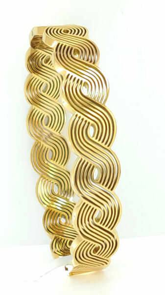 Aranyszínű nemesacél (316L) karperec, melyet fonott hullám minta díszít. A minta a karkötő teljes kerületét díszíti. A karperec kinyitható a könnyebb felhelyezés érdekében. Minőségi, tartós anyagának köszönhetően akár mindennapi viseletnek is alkalmas, nem feketedik, nem színezi a bőrt. Antiallergén ékszer. 14K arany színben kapható. Szélessége: 12 mm. Belső átm