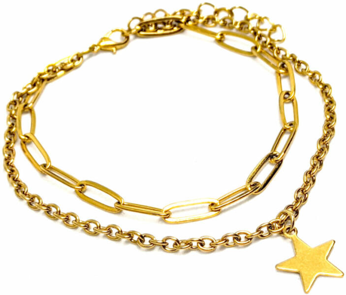 Csillag charmos karkötő. Paraméte rek: Charm mérete 1,4 cm. Anyaga nemesacél, karkötő anyaga rozsdamentes acél. Karkötő mérete 17+5 cm. (Ha ettől eltérő méretet szeretnél, rendeléskor a MEGJEGYZÉSBE írd be. ) Szélessége 3 és 4 mm.
