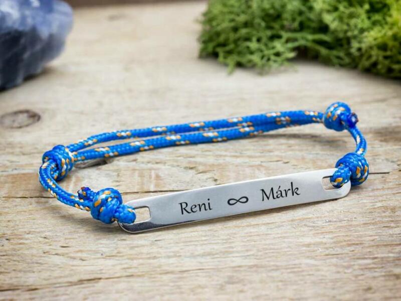 Ezt az egyszerű, de mégis egyedi karkötő ajándék ötlet ünket e gy microcord zsinór , és egy acél medál alk ot ja . A karkötőt egy lap alakú 49×6,3 mm-es méretű elegáns acél medál díszíti, amit gravírozunk , így személyesebbé téve az ajándékot . A nemesacél más néven orvosi fém medál nem allergizál , ezért fémre érzékenyeknek is bátran ajánljuk . Mindemelle