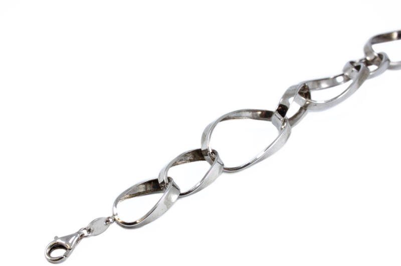 Modern stílusú, mutatós nagy szemekből álló "pancer" típusú, fényes ródiumozott felületű, ezüst karlánc.
