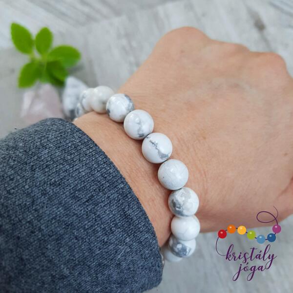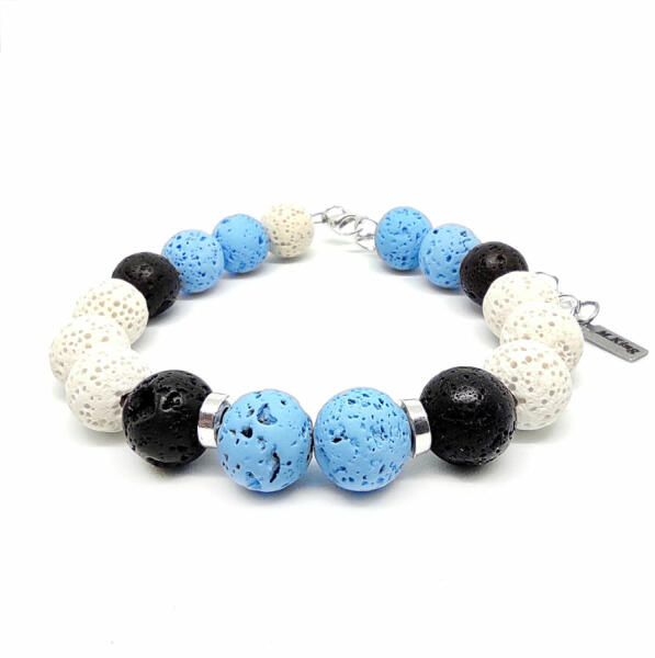 Figyelem! Nem szakad, nem nyúlik! Tartós ékszer. Kérheted csat nélküli rugalmas gumidamilra is. Amennyiben rugalmas damilra kéred, Megjegyzésbe írd be rendeléskor, hogy csat helyett rugalmas gumidamilt kérsz, és a csuklód körbemért méretét is írd meg. Az ékszer ásványai és tartozékai: – 10 mm-es matt fehér, kék és fekete lávakő ásványok – Ezüst színű nemesa