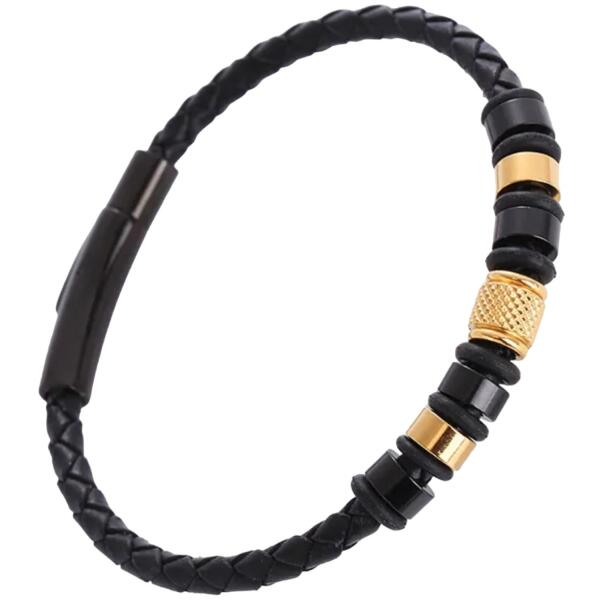 George karkötő Ez az elegáns karkötő a modern stílust luxuselemekkel ötvözi, a fekete fonott bőr és az arany részlet révén. Ideális olyan férfiak számára, akik kifinomult kiegészítőt keresnek, amely kiemeli személyiségüket. Az arany fém elemek egyedi megjelenést kölcsönöznek a karkötőnek, amik a fekete bőr struktúrával kontrasztban érdekes vizuális hatást hoznak