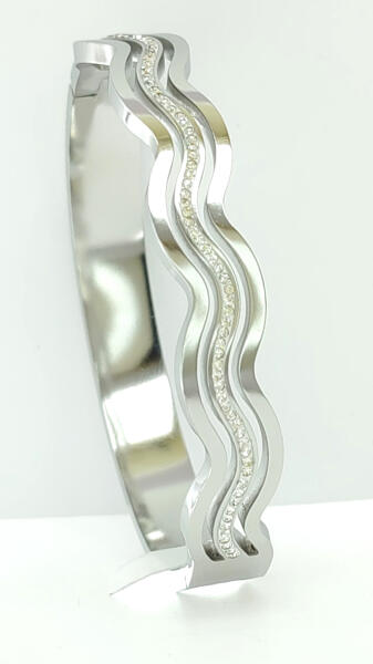 Ezüstszínű nemesacél (316L) hullám formájú karperec, melyet csillogó fehér cirkónia kristályok díszítenek. A kristályok ragasztott foglalatban helyezkednek el, a karperec elülső felét díszítik. A karperec kinyitható a könnyebb felhelyezés érdekében. Minőségi, tartós anyagának köszönhetően akár mindennapi viseletnek is alkalmas, nem feketedik, nem színezi a bőrt. A