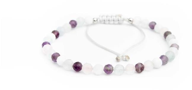 KÉZZEL KÉSZÜLT MINŐSÉGI ALAPANYAGOK EGYEDI TERVEZÉS A karkötőt olyan kristályok alkotják, melyek támogatják a nőiességedet a mindennapokban. Akvamarin, ametiszt, holdkő, rózsakvarc ásványokból készült. AKVAMARIN - bátorság köve AMETISZT - spiritualitás köve HOLDKŐ - nőiesség köve RÓZSAKVARC - szeretet és a végtelen béke köve Rozsdamentes acél kiegészítők: MI