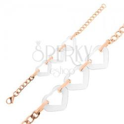 316L acél karkötő ezüst színben, egy szélesebb ovális szemű láncból áll. Középen pedig, három kerámia szív körvonal található sötét szürke, fekete színben, amelyek acél szemekkel kapcsolódnak középen egymáshoz. A szívek fehér tükröződéssel rendelkeznek. Hormák kapcsos zárodás. Karkötő szélesség: 6 - 18 mmKarköto hossza: 210 mm (+/- 5 %)