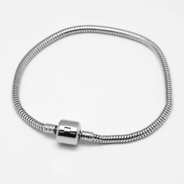 Pandora stílusú alap karkötő, rozsdamentes acél - 21 cm. Méret: 21 cm, charmok tehetők rá. Kiváló kivitelezés, jó minőségű anyag felhasználásával. Kb. 3 mm vastag, 21 cm hosszú, csat: 10x10 mm. Anyaga 304 rozsdamentes acél. Figyelem! Általánosan elfogadott a Pandora stílusú karkötők esetében, hogy a szorosan mért csukló körméretnél 2 cm-rel nagyobb karkötőt kell v