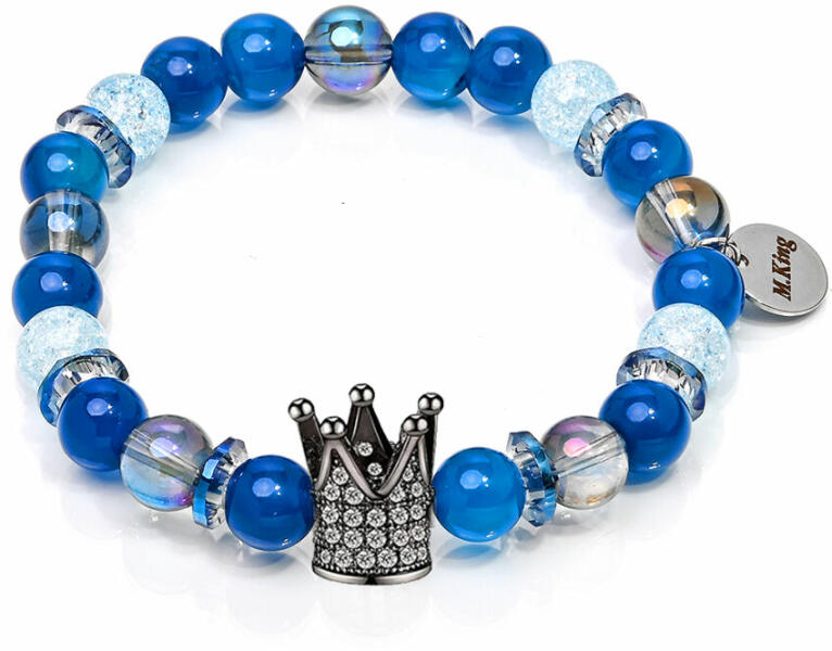 Gyönyörű osztrák kristály, hegyikristály és ónix achát karkötő, sejtelmes kékség, különleges szín- és formavilág, minden, csak nem megszokott, hétköznapi. A jeges kékség elvarázsol és a hűvös elegancia magával ragadó, különleges csillogása igéző. A Maria King kollekció kiemelt darabja. A korona dísz gyönyörűen kidolgozott, még tovább emeli a karkötő fény