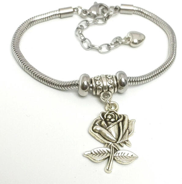 Ezüstszínű nemesacél ( 316L ) pandora jellegű karkötő, melyet rózsa charm díszít. Mutatós, különleges darab. A karkötő delfin zárral rendelkezik. Tartós, időtálló ékszer, nem feketedik, nem színezi a bőrt. Antiallergén ékszer. Karkötő hossza: 17 cm + 3,5 cm hosszabbító. Karkötő szélessége: 3 mm. Charm mérete: 22 mm x 17 mm. A nemesacél ékszerek rendkívül néps