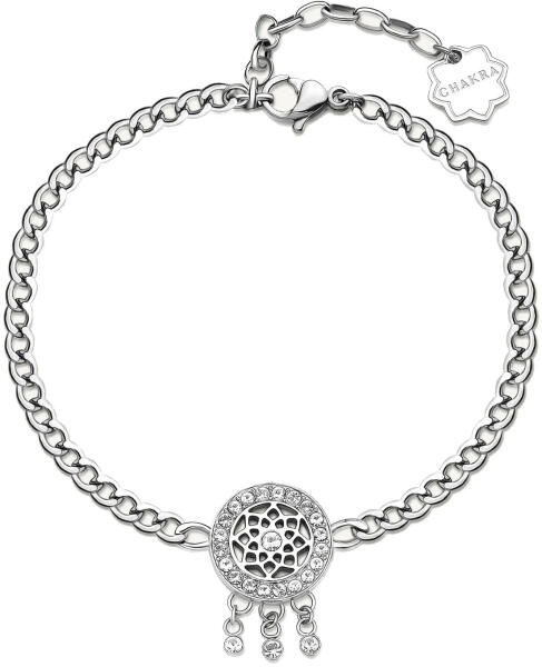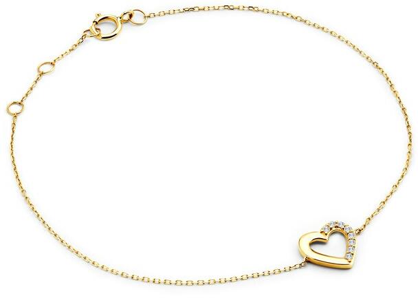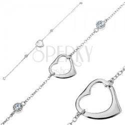 A ródiummal kezelt, 925 ezüst karkötő ovális elemekből álló láncból tevődik össze, amelyet két kerek, átlátszó cirkónia díszít, díszes, bemetszésekkel ellátott foglalatba elhelyezve. A cirkóniák között egy tükörfényes szív körvonal található, enyhén kidomborodó és sima felülettel. A karkötőnek állítható hossza és delfinkapcsos zárszerkezete van. Lánc sz