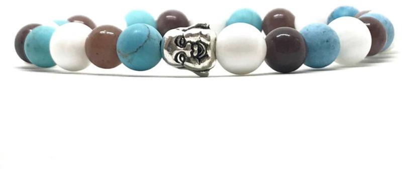 Egyedi ásvány karkötő Buddha fej köztes dísszel A 8mm-es Mokait, Türkiz és Jáde ásvány golyókból készült karkötő speciális gumis damilra van fűzve, buddha fej díszítéssel. Amit a Mokaitról tudni kell: Segíti a gennyes és gyulladt sebek gyógyulását, enyhíti a torokfájást és a száraz köhögést. Harmonizáló és kiegyensúlyozó hatású. Amit a Jádéról tudni ke