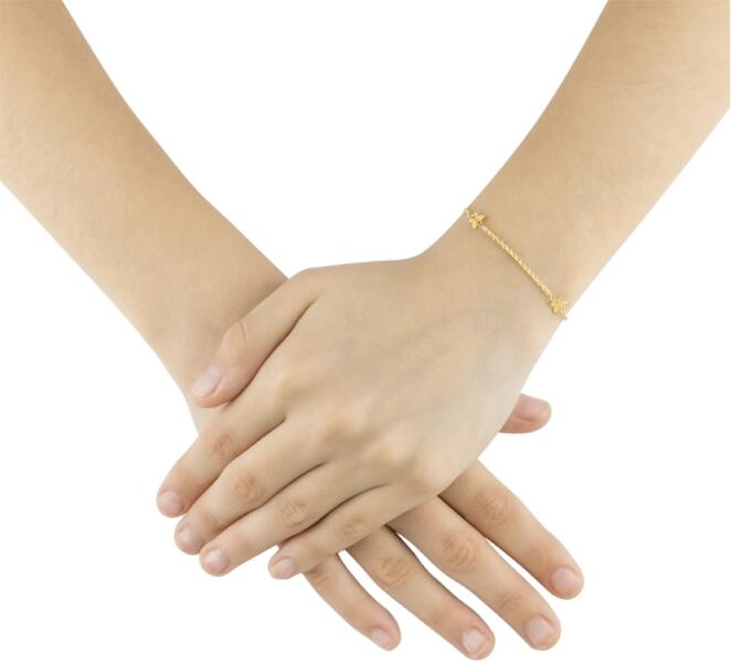 Lánc szélessége: 1,4 mmA karkötő hossza: 120 mmHosszabbító lánc hossza: 20 mmTeljes hossz hosszabbítással: 140 mm (+/- 5%)Pillangó méretei: 5 x 5,5 mmA tárcsa átmérője: 8 mmA karkötő súlya: 1,33 gFémjel - Van. 14K sárga arany gyerek karkötő pillangós és virágos medálokkal 14K sárga arany gyerek karkötő, kerek láncszemekből áll. A láncot két pillangó tükörfény
