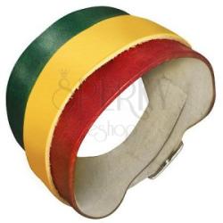 A bőrből készült csuklópánt háromszínű. A zöld-sárga-piros sávok a karkötő felét alkotják, finoman ívelve csatlakoznak a csathoz. A másik oldalon a karkötő egy sárga színű szíjban folytatódik, a szíjat a pánton keresztül átbújtatva kétszer kell megtekerni. A csat ezüstösen fémes színű. Szélesség: 14 - 40 mmHosszúság: 480 mm