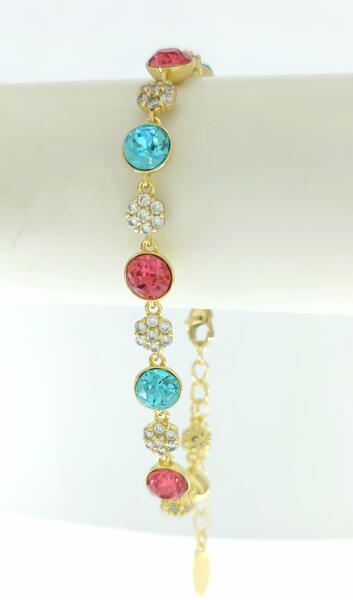 Aranysárga színű karkötő, melyet fehér, égszínkék és rózsaszín Swarovski kristályok tesznek csillogóvá. A kristályok ragasztott, peremezett, karmos foglalatban helyezkednek el. A kristályok a karkötő teljes hosszát díszítik. Időtálló ékszer, nem feketedik víz hatására sem. Antiallergén ékszer. 14K arany színben kapható. Karkötő szélessége: 8 mm. Karkötő hossz