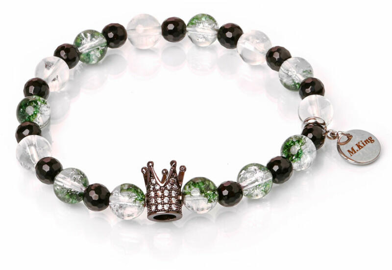 Üde, frissítő stílus, könnyed ékszer a mindennapokra, sejtelmes zöld fantomkvarc és határozott fekete obszidián, kiegészítve egy remek kidolgozású arany színű strasszos Korona dísszel. A Maria King kollekció exkluzív darabja. A korona dísz gyönyörűen kidolgozott, még tovább emeli a karkötő fényét. Figyelem! A képen exkluzív kivitelű, rugalmas karkötő látható kap