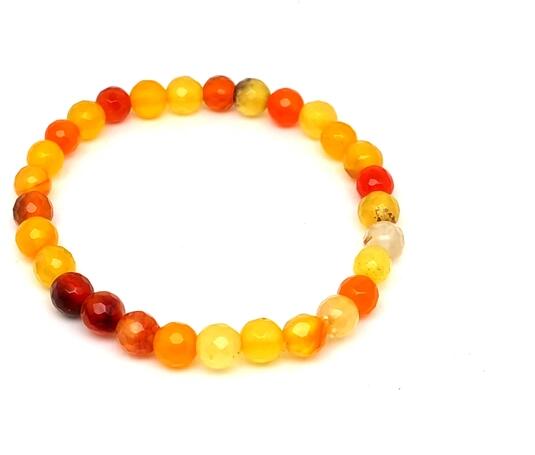 Achát karkötő (golyó fazettált szinezett narancs Kína Karkötő ásvány) Az ásvány golyók gumira vannak felfűzve. Az ásványok színbeli aránya eltérhet a képen láthatótól. Amit az achátról érdemes tudnod: Az achát minden színben fellelhető, többnyire szürke, kékesszürke, zöldesszürke, szürkésfehér, barna csíkozással, áttetsző. Lelki gyógyhatás: Az achát lel