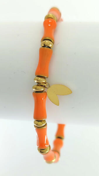 Arany-narancssárga színű nemesacél (316L) karperec. A karperec kialakítása bambusz alakját formázza. A karperec szemei rugalmas szálra vannak felfűzve a könnyebb felhelyezés érdekében. Minőségi, tartós anyagának köszönhetően akár mindennapi viseletnek is alkalmas. Antiallergén ékszer. 14K arany színben kapható. Karperec szélessége: 4,5 mm. Karperec belső átmérője: 5