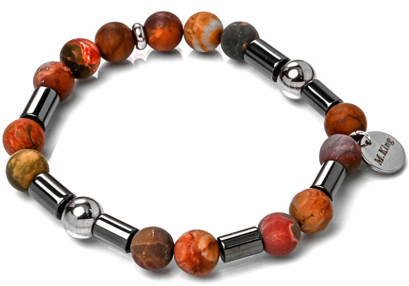Különleges színű és formájú jáspis és hematit karkötő. Vagány, férfias, de mégis nőknek is tökéletes választás egy sportosabb öltözékhez. Figyelem! A képen exkluzív kivitelű, rugalmas karkötő látható kapocs nélkül, de kérheted extra erős acélsodronyra is delfinkapoccsal és 5 cm hosszabbítólánccal. Ha a kapcsos verziót kéred, ami nem szakad, nem nyúlik, vál