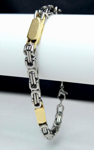 Nemesacél (316L) karkötő ezüstszínben, aranyszínű köztes szem díszítéssel. Tartós, időtálló ékszer, nem feketedik, nem színezi a bőrt. Mindennapi viseletre is tökéletes választás. Antiallergén ékszer. 14K arany-ezüst színben kapható. Karkötő szélessége: 6 mm. Karkötő hossza: 21,5 cm. A nemesacél ékszerek rendkívül népszerűek kedvező tulajdonságaik miatt. A