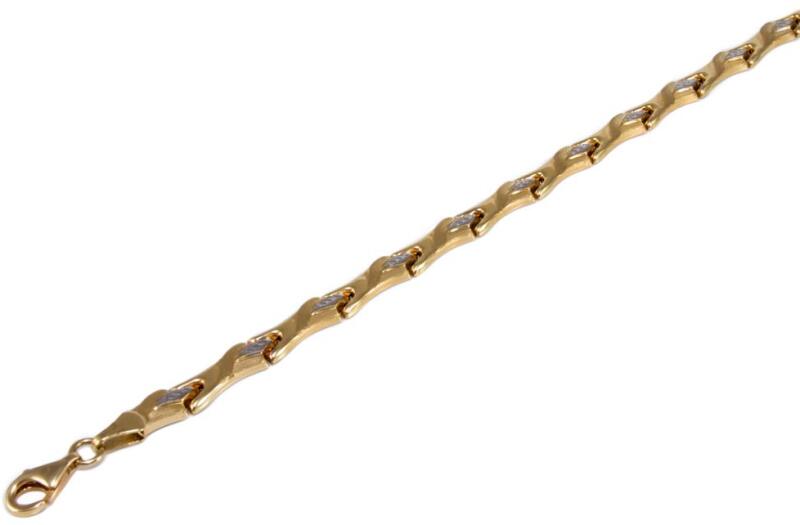 Modern stílusú, csillogó véséssel, ródiummal és mattítással ékített, üreges, de masszív szemekből készült stiftes arany karkötő.