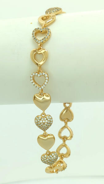 Aranyszínű karkötő, melyet fehér cirkónia kristályok tesznek csillogóvá és szív formájú szemek díszítenek. A kristályok karmos foglalatban helyezkednek el, a karkötő felét díszítik. Időtálló ékszer, nem feketedik víz hatására sem. Mindennapi használatra is tökéletes választás. Antiallergén ékszer. 18K arany színben kapható. Karkötő szélessége: 8 mm. Az anti