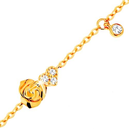 585 arany karkötő lapos ovális szemekből, amelyeken medálok találhatóak - rózsa egy csillogó szívvel összekapcsolva. A karláncon függ egy további cirkónia, foglalatba helyezve. A hossza állítható, kerek kapoccsal rendelkezik . Medálok mérete: 9 x 5 mmCirkónia átmérője: 2 mmLánc szélessége: 1 mmLánc hossza: 165 mmHosszabbítható rész: 20 mmTeljes hossz: 185 mm (+/- 5 %