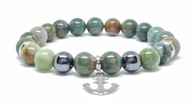 Kiváló minőségű valódi achát indiai ásványból készült ásvány karkötő. Az indiai achát ásvány karkötő gazdag, földszínekben játszó tónusai egyediséget adnak, miközben viselése az állhatatosság és belső erő szimbóluma lehet a mindennapok során. A karkötő valódi achát indiai, hematit 8-9 mm ásványból és nemesacél köztes és horgony, logó dísszel készü