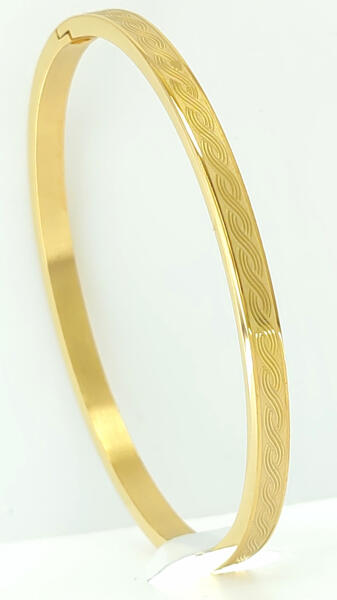 Aranyszínű nemesacél (316L) karperec, melyet gravírozott hullám minta díszít. A pillangók a karperec teljes kerületét díszítik. A karperec kinyitható a könnyebb felhelyezés érdekében. Minőségi, tartós anyagának köszönhetően akár mindennapi viseletnek is alkalmas, nem feketedik, nem színezi a bőrt. Antiallergén ékszer. 14K arany színben kapható. Szélessége: 4 mm. Be