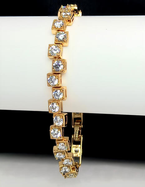 Aranyszínű karkötő, melyet fehér cirkónia kristályok tesznek csillogóvá. A kristályok karmos foglalatban helyezkednek el. Időtálló ékszer, nem feketedik, nem színezi a bőrt ("gold filled"). Mindennapi használatra is tökéletes választás. Antiallergén ékszer. 18K arany színben kapható. Karkötő szélessége: 7 mm. Az antiallergén ékszerek olyan fémötvözetből készüln