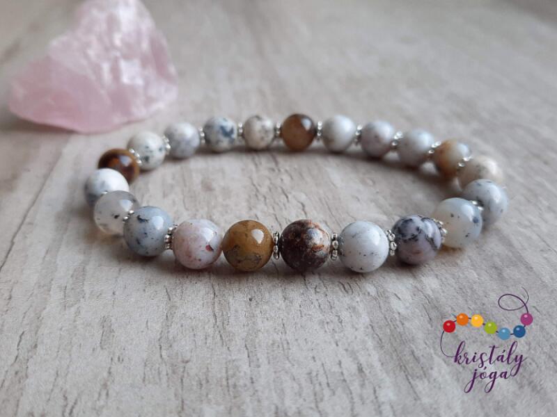 Hegyikristály és Rózsakvarc ásványból készült női karkötő rózsa medállal Gyöngyök mérete: 8 mm-es ásványgyöngyök Rugalmas, gumis ékszerdamil alapra készült A Hegyikristály a 12 mesterkristály egyike. A hegyikristály hatása rendkívül sokoldalú, mestergyógyító. Erősíti más ásványok hatását, ezért bármilyen ásvánnyal együtt használhatjuk, illetve viselhet