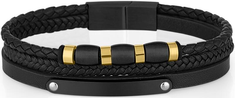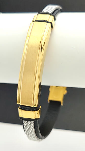 Ezüstszínű nemesacél (316L) sodrony jellegű karkötő, aranyszínű nemesacél ( 316L ) gravírozható betéttel és csattal. A karkötő belső felén valódi bőr rész található, kényelmes, tartós viselet, nem feketedik. Antiallergén ékszer. 14K arany-ezüst színben kapható. Karkötő hossza: 20,5 cm. Karkötő szélessége: 8 mm. Betét mérete: 40 mm x 10 mm. A gravírozást part
