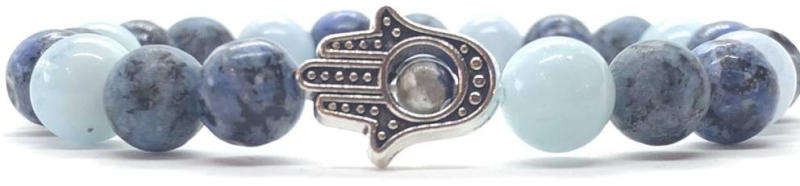 Egyedi ásvány karkötő Hamsa-védelmező kéz dísszel A 8mm-es Amazonit és kék Crazy Achátok ásvány golyók gumis damilra vannak felfűzve, hamsa kéz díszítéssel. Amit az achátokról tudni kell: Az achát rengeteg színben fellelhető, többnyire szürke, kékesszürke, zöldesszürke, szürkésfehér, barna csíkos, áttetsző. Az achátok testi és lelki hatásai: Tisztítja az aur