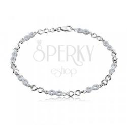 925 ezüst karkötő végtelen formájú szemekből. Szélesebb, víztiszta cirkóniával kirakott szemek és keskenyebb, fényes szemek váltakoznak. A végtelen formákat fényes karikák választják el egymástól. A karkötő delfinkapcsos. A karkötő szélessége: 3,8 mmA karkötő hossza: 195 mm (+/- 5 %)A karkötő súlya: 4,1 gFémjelzéssel ellátott.