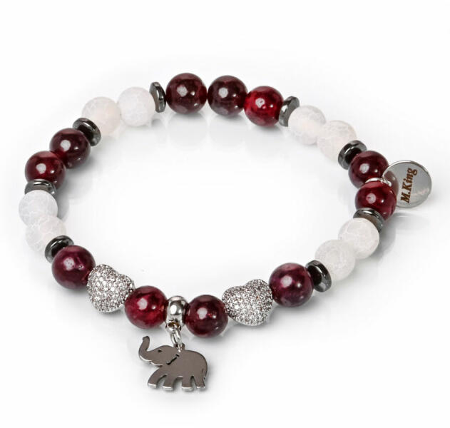 Gyönyörű gránát, hematit és achát karkötő, egyenesen a távoli Afrikából. Elefántos nemesacél charmmal kiegészített mélybordó gránát és sejtelmes tűz achát, a föld mélysége, a természet ereje egyetlen karkötőn. A Maria King kollekció kiemelt darabja. Figyelem! A képen exkluzív kivitelű, rugalmas karkötő látható kapocs nélkül, de kérheted extra erős acélsodr