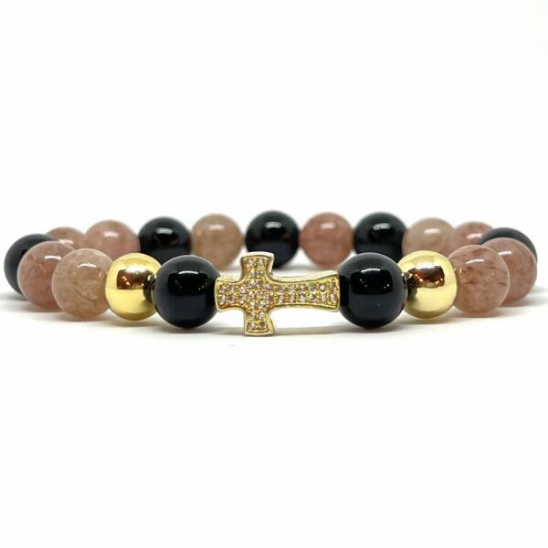 Cirkón gyöngy díszítésű Shamballa ásvány karkötő A 8mm-es Ónix és Eperkvarc ásvány golyókból készült egyedi ásvány karkötő speciális gumis damilra van fűzve, arany színű Cirkón kereszt díszítéssel. Amit az Ónixról tudni kell: Az ónix általában fekete, néha előfordulhat fehér, szürkés csíkozódással is. Az Ónix testi és lelki hatásai: Az ónix egy védel