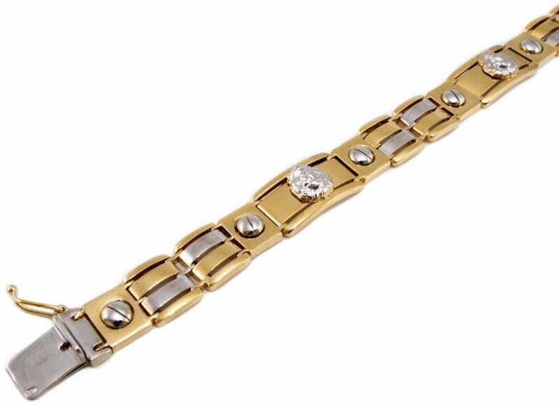 Modern stílusú, oroszlánfejes rátétekkel, mattítással és ródiummal díszített, igen mutatós stiftes férfi arany karkötő.