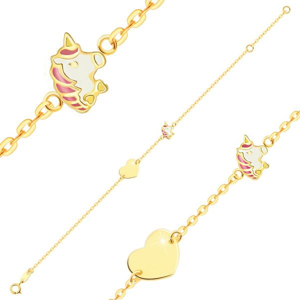 A 14K sárga aranyból készült karkötő függőlegesen egymáshoz kapcsolódó ovális alakú láncszemekkel. A díszítő részt két medál képviseli. Az egyik egy lapos, szimmetrikus, sima és tükörfényes felületű, szimmetrikus szív. A másik medál egy fehér egyszarvú rózsaszín sörénnyel. A szarv és a csokornyakkendő sárga mázzal van bevonva. A részletes rajz és az egyes