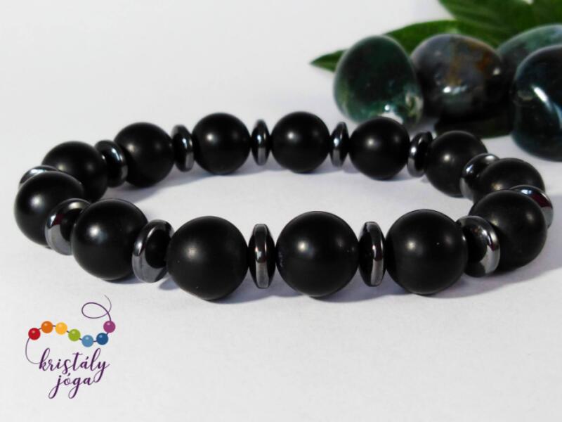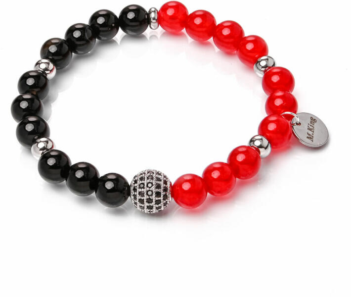 Ónix achát és piros jade karkötő, nagyon különleges szín és textúra párosítás, az ónix mélyfekete színe és a jade vad vörös árnyalata remek kontrasztot alkot és mégis harmóniát, nem túl fekete és nem túl piros, pont jó. A Maria King kollekció kiemelkedő darabja. Figyelem! A képen exkluzív kivitelű, rugalmas karkötő látható kapocs nélkül, de kérheted extra er