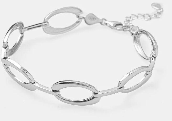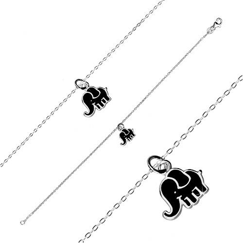 925 ezüst karkötő akasztós medállal. A lánc lapos ovális láncszemekből áll, amelyek egymásra merőlegesen forrasztottak. A fényes láncélek csillogó hatást kölcsönöznek a karkötőnek. A medál egy fekete zománccal díszített elefánt, amely másik oldala sima és fényes. A karkötő delfin kapoccsal készült. A díszes rész méretei: 12 x 12 mmA karkötő szélessége: 1,1