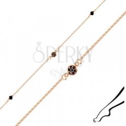 A réz színű bokalánc 925 ezüstből készült, egy kerek foglalatba süllyesztett cirkónia virág díszíti. A láncon két csillogó fekete cirkóniakő rögzített. A lánc egymásra merőlegesen forrasztott ovális szemekből áll. A lánc hosszabbítható és delfinkapoccsal készült. A lánc szélessége: 1,4 mmA lánc hossza: 230 mmToldólánc hossza: 20 mmA teljes hossza: 250 mm (+/-