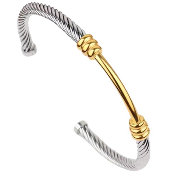 Poly Karkötő Ez az arany és ezüst részleteket kombináló karkötő tökéletes példa a klasszikus dizájn és a modern divat kombinációjára. Két színből álló kialakítása miatt ez a karkötő univerzális, könnyen kombinálhatja többfajta öltözködési stílussal és más ékszerekkel. Az ezüst színű szára tekert struktúrájú, mely hatásosan veri vissza a fényt, miközb