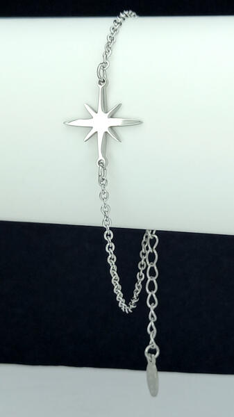 Ezüstszínű nemesacél (316L) karkötő, melyet Esthajnal csillag medál díszít. Tartós, minőségi anyagának köszönhetően nem kopik, nem színeződik, mindennapi viseletre is alkalmas. Antiallergén ékszer. Hosszúsága: 16 cm + 3 cm hosszabbító. Karkötő szélessége: 1,5 mm. Esthajnal csillag medál mérete: 15 mm x 15 mm. A nemesacél ékszerek rendkívül népszerűek kedvező tu