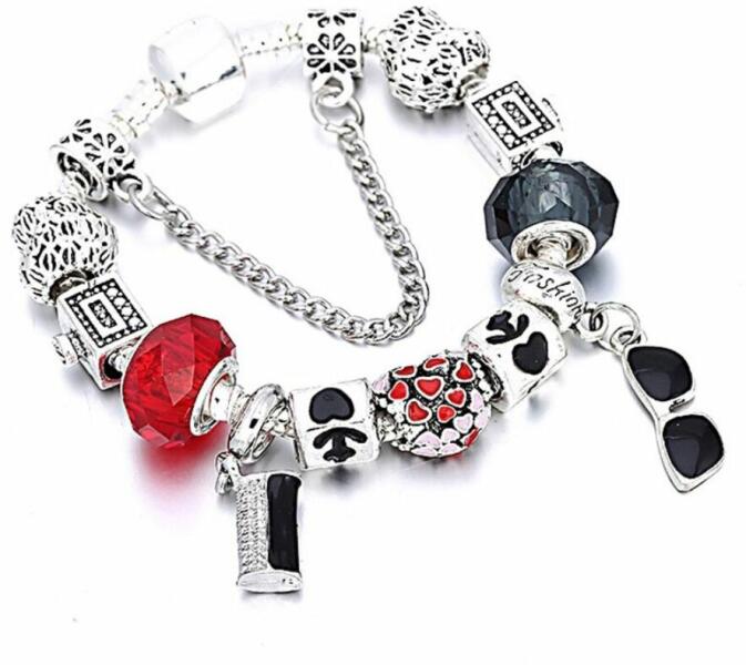 Szív, napszemüveg és kistáska motívumos Pandora stílusú karkötő, 18 cm. Nagyon trendi és mai stílus. Hossza: 18 cm. Fémötvözet és kristály. Az egyik üveg charm piros, a másik barna (eltér a képtől). Egy jól megválasztott ékszer öltöztet, feldobja a napodat, valahányszor ránézel, jobb kedvre derülsz. A színekkel és anyagokkal manapság könnyű variálni a különbö
